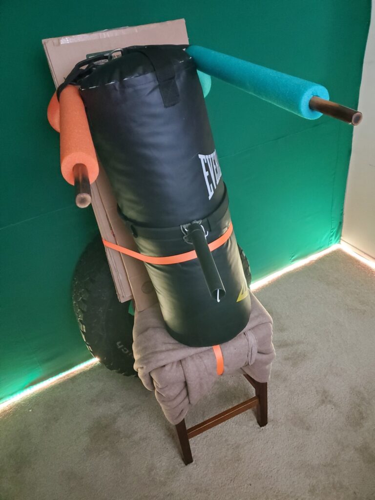 *Heavy bag + 4 Cardboard boxes + Tie strap = bag support for punches, elbows, knees & kicks…not hard tho. 😉